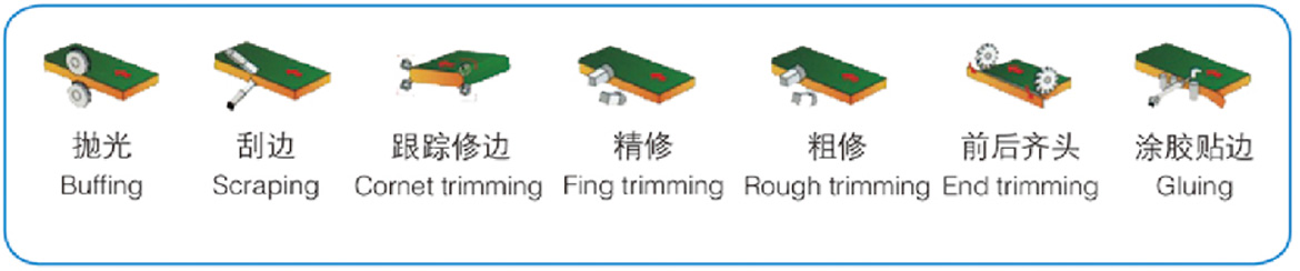 Separation-Pre-milling-Glue 1 (Quick Sol Gluing Pot)-Cut Tape 1- Press Paste 1- Glue 2- Cut Tape 2- Press Paste 2- Full Head and Tail-Rough Repair-Fine Repair-Tracking-Scrape Edge-flat scraping-cleaning-polishing 1-polishing 2
